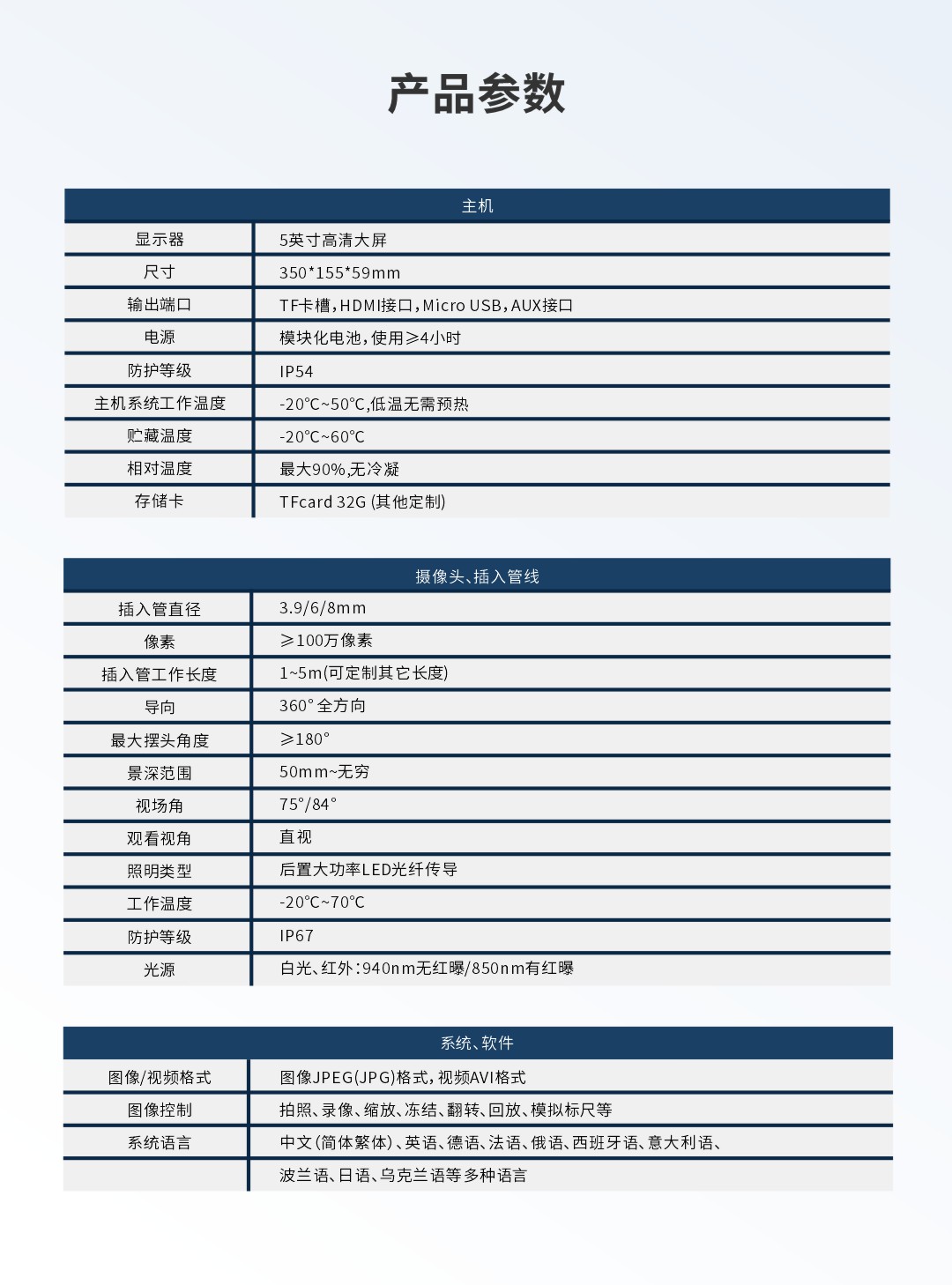 優(yōu)勢(shì)特點(diǎn):紅白雙光源一鍵切換;攝像頭拾音、錄音功能;探頭360°轉(zhuǎn)向;可更換不同類(lèi)型管線;